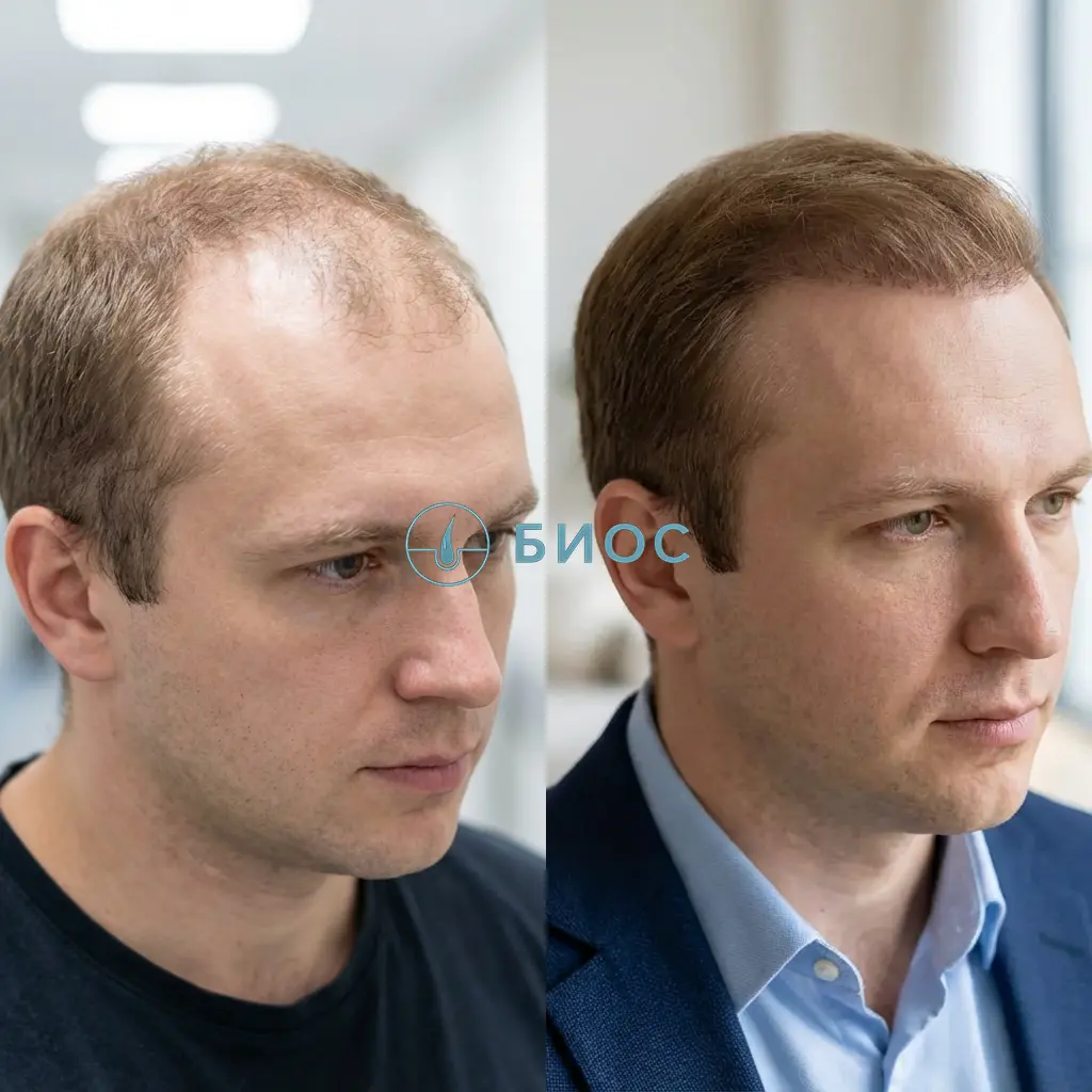 Основной запрос — вернуть плотность в зоне лба и макушки. После пересадки и восстановления густота стала визуально равномерной, линия роста волос — естественной.